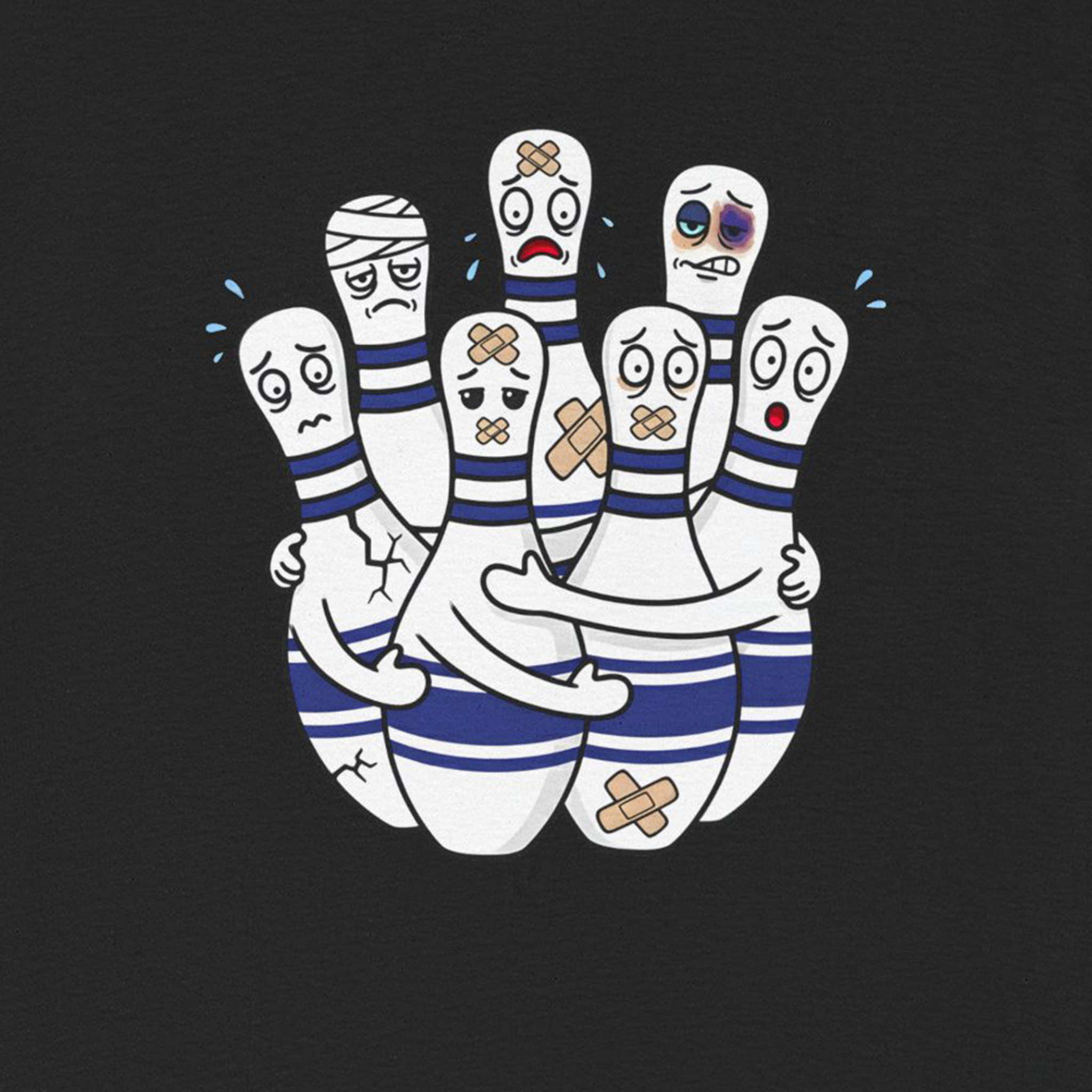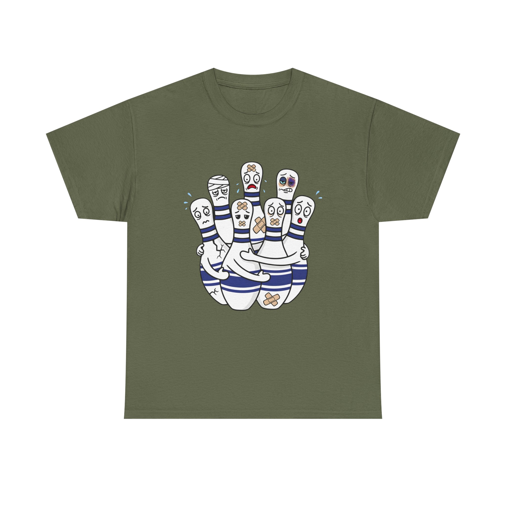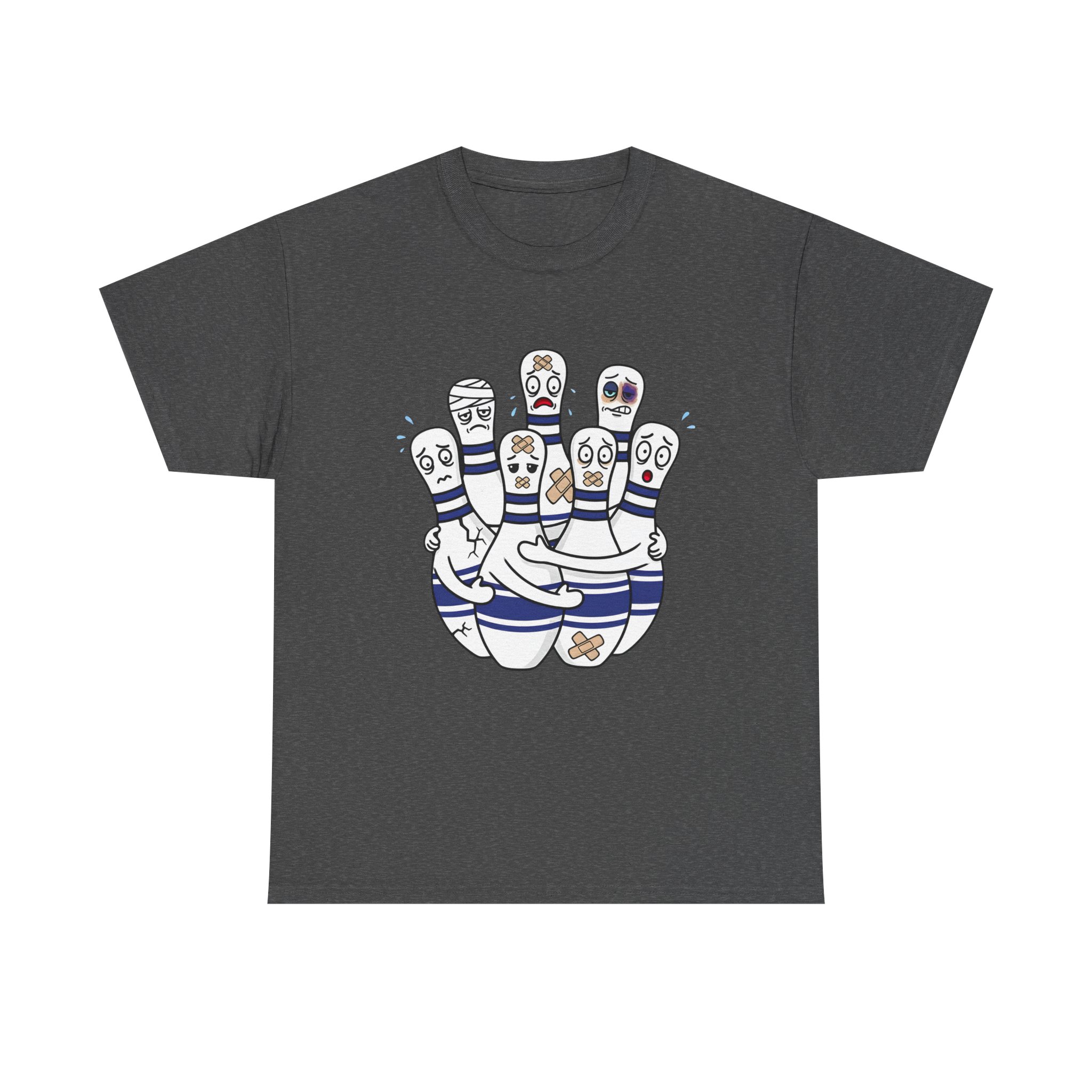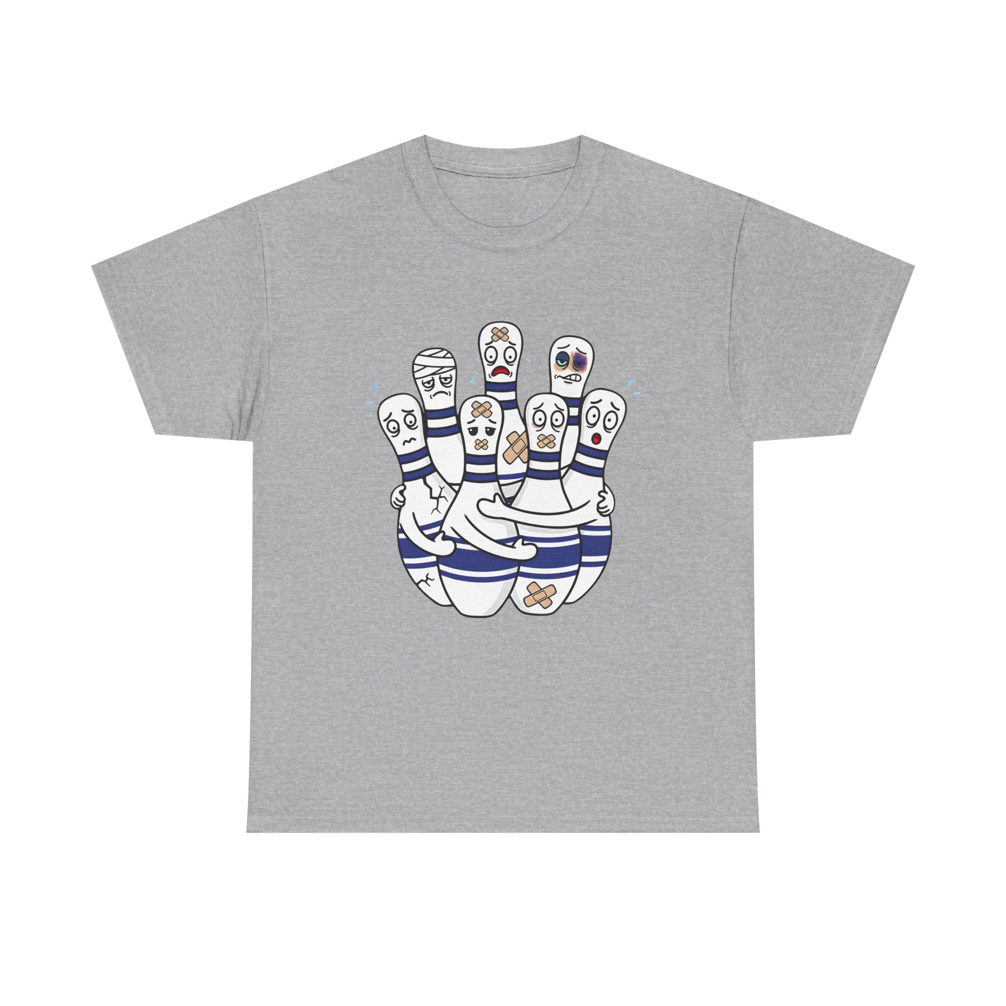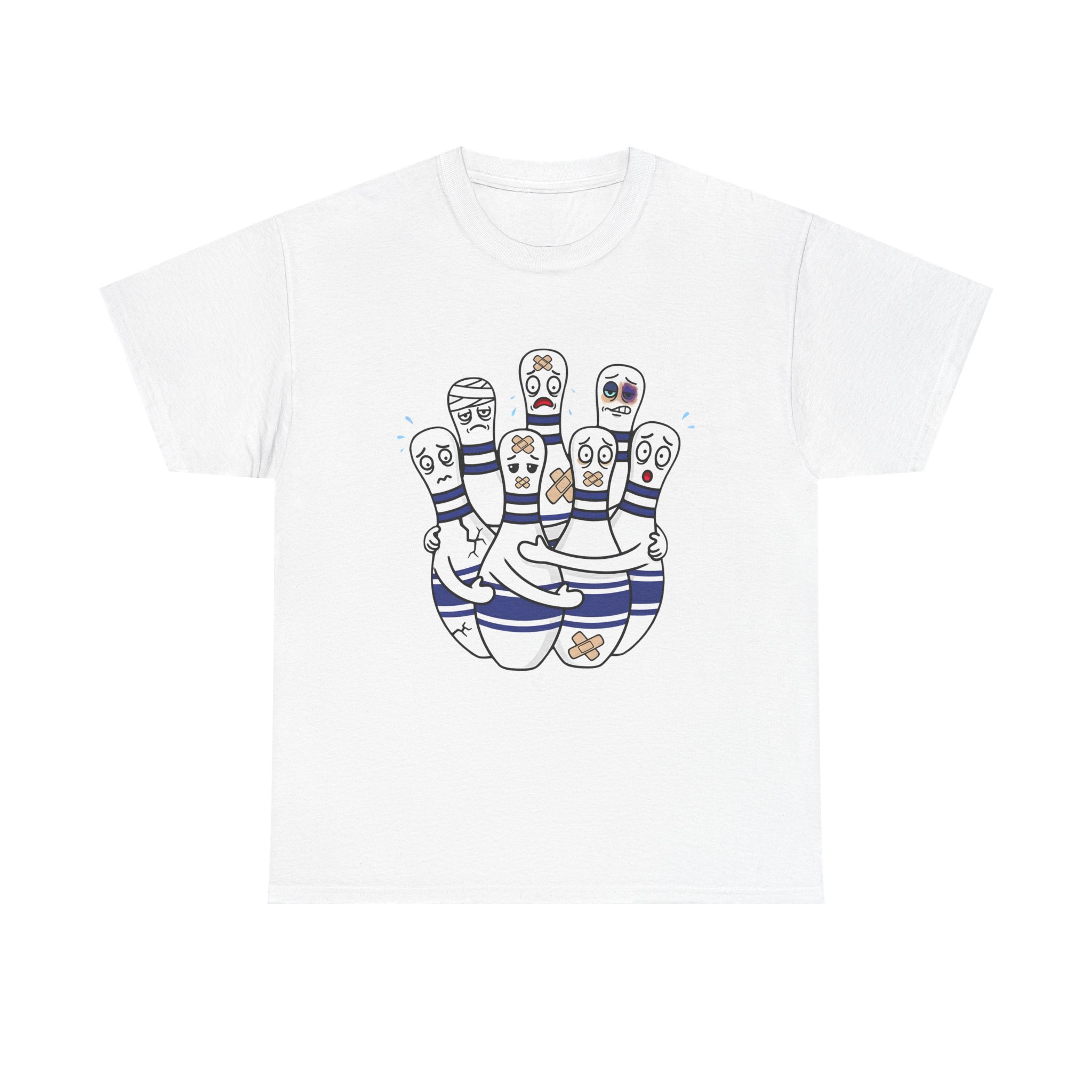Introducing our Unisex Heavy Cotton Tee, This funny bowling t-shirt shows a group of injured bowling pins with bandages and scared faces. A perfect gift for anyone who loves bowling and has a great sense of humor.