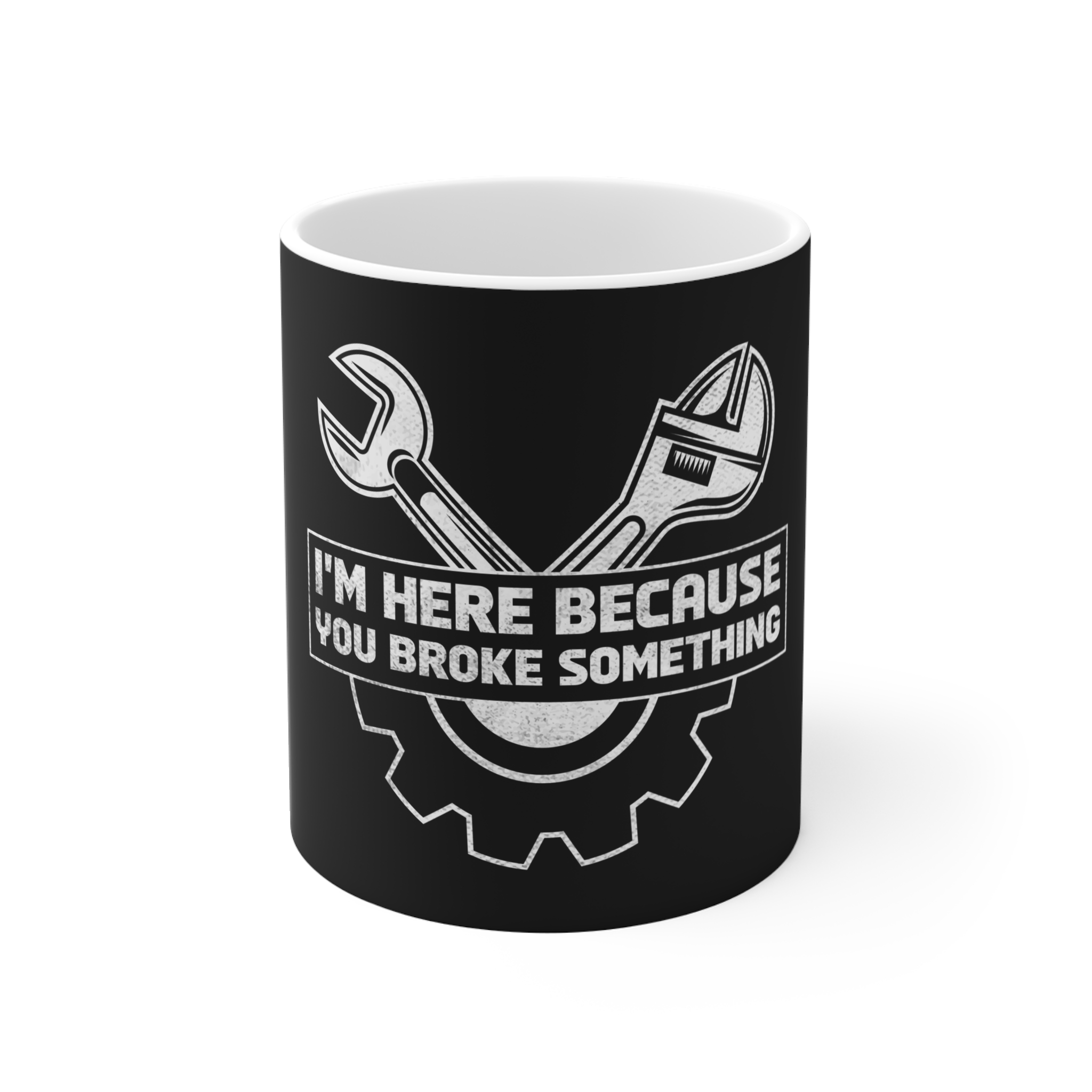 Got a knack for fixing things? Or maybe you’re the go-to person whenever something breaks? This hilarious “I’m Here Because You Broke Something” mug is made for you! Featuring a clever design with wrenches and a gear, it’s the perfect way to show off your indispensable skills with a touch of humor.