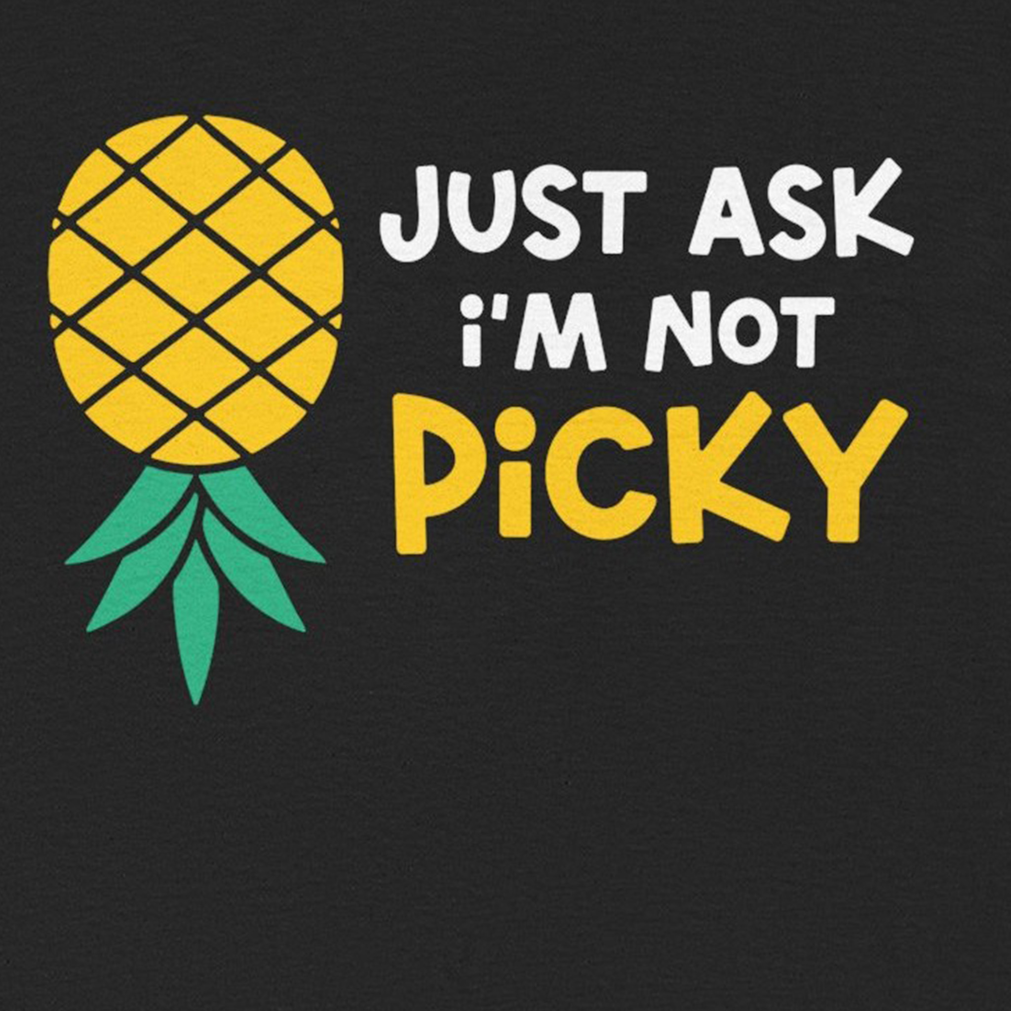 Introducing our Unisex Heavy Cotton Tee, This fun t-shirt features the playful quote: “Just Ask, I’m Not Picky” alongside a cute pineapple graphic. A perfect choice for anyone with a good sense of humor.