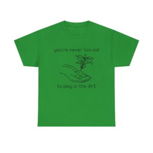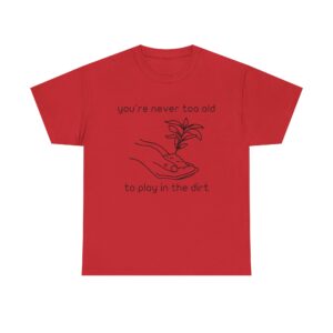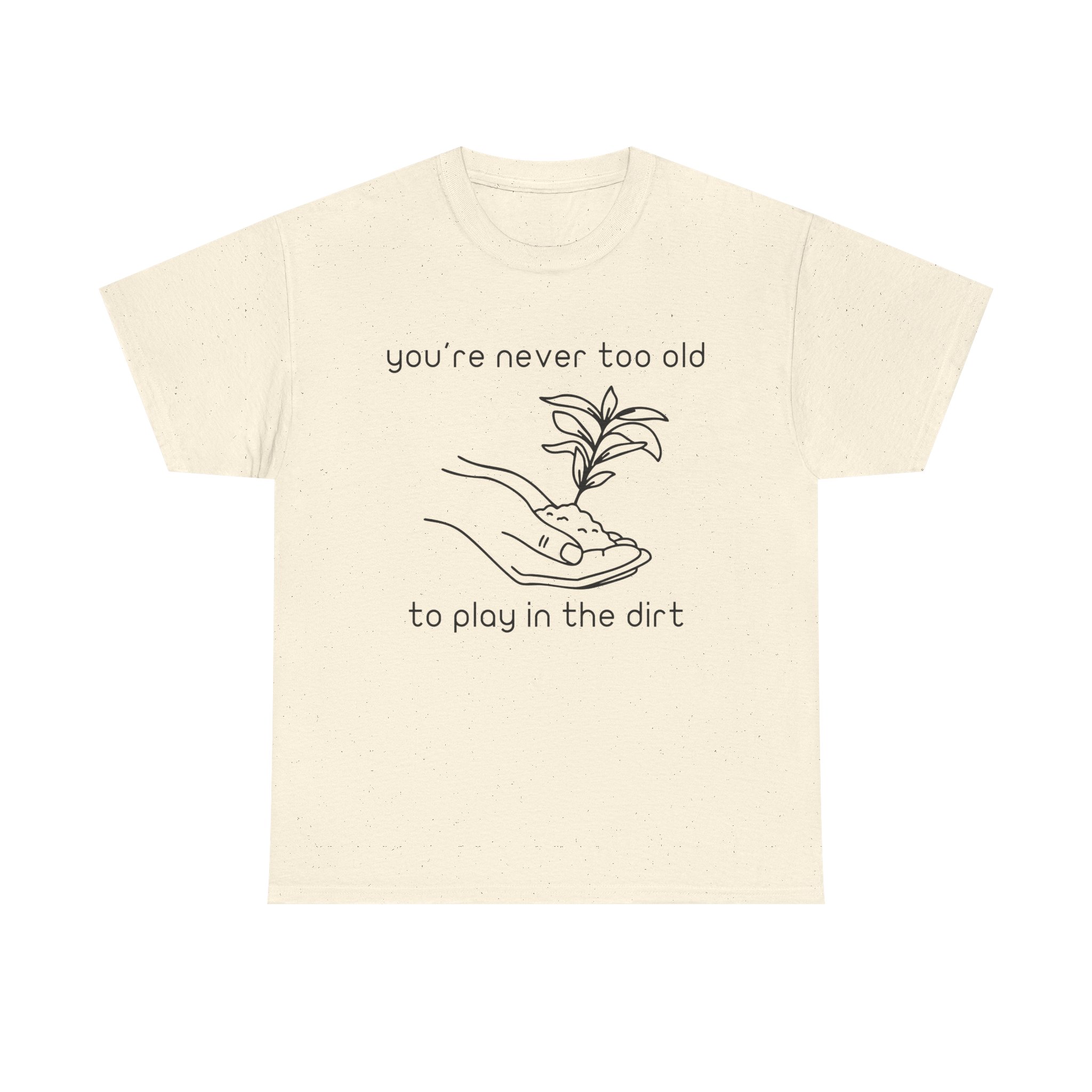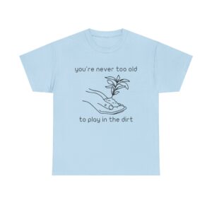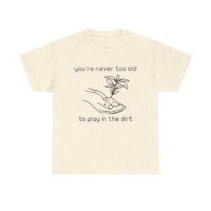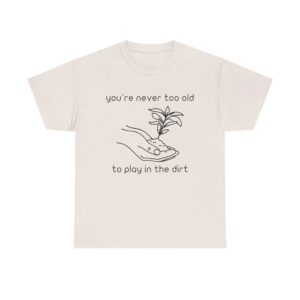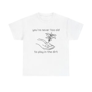 Introducing our Unisex Heavy Cotton Tee, This “You’re Never Too Old to Play in the Dirt” t-shirt is perfect for anyone who loves gardening and nature. With a simple hand and plant design, it reminds you that playing in the dirt never gets old. Comfortable, soft, and ideal for everyday wear or as a gift for plant lovers.